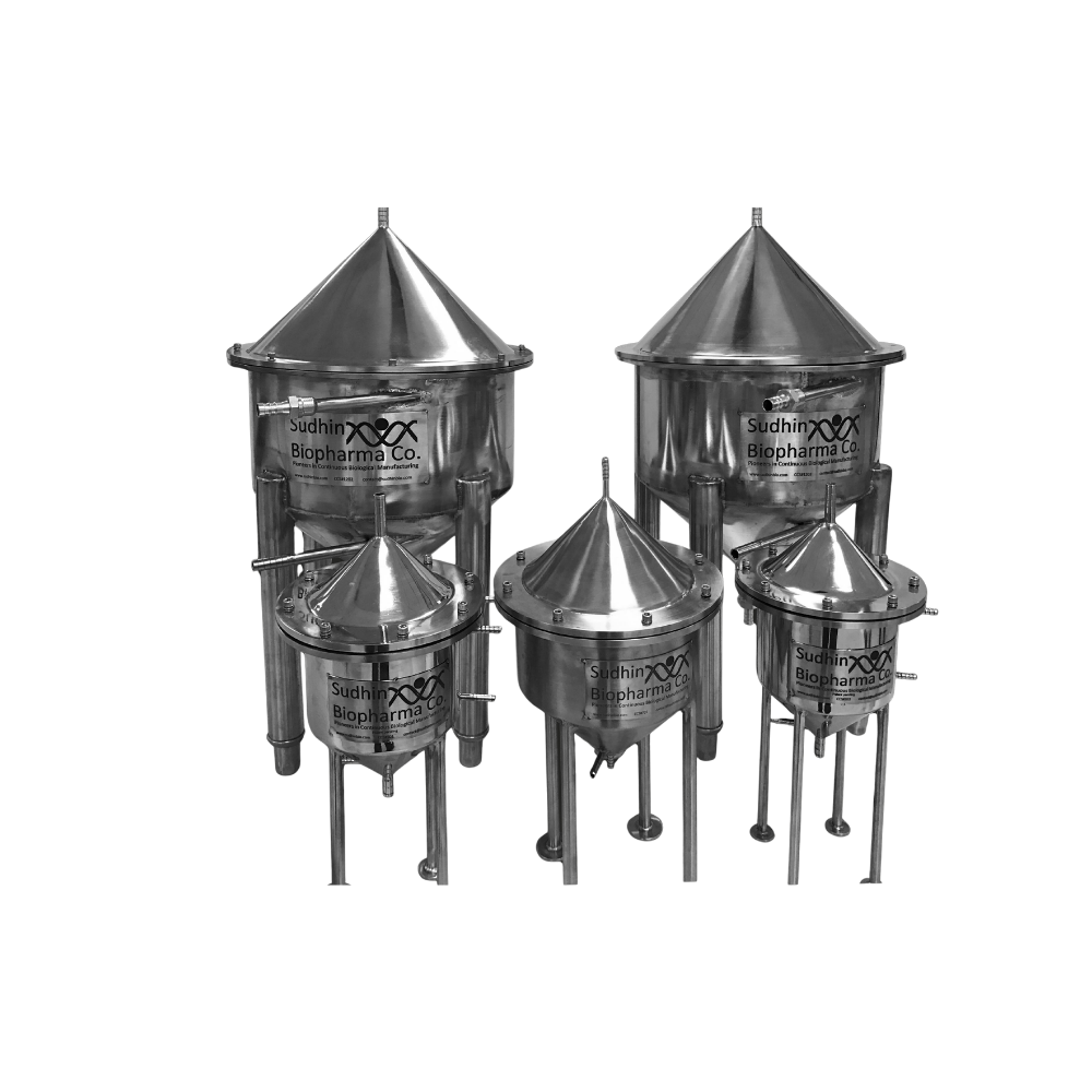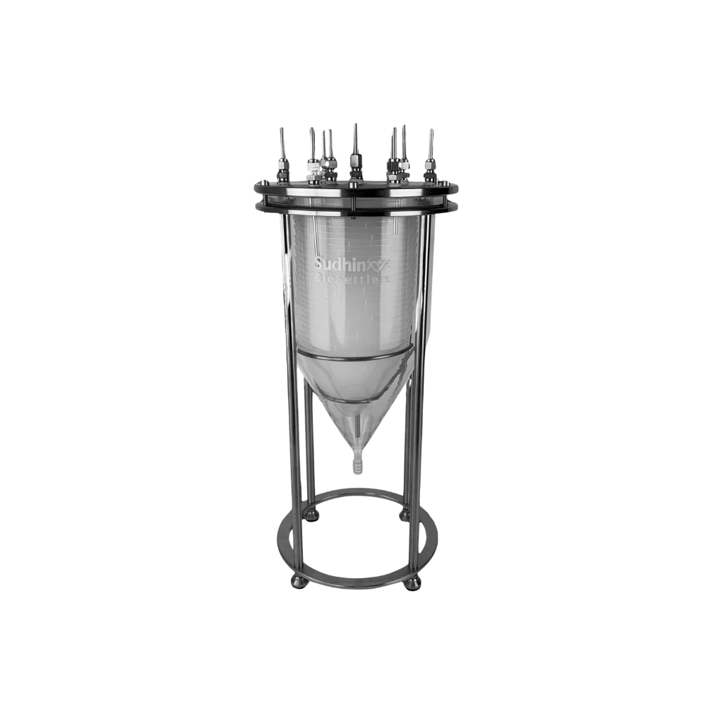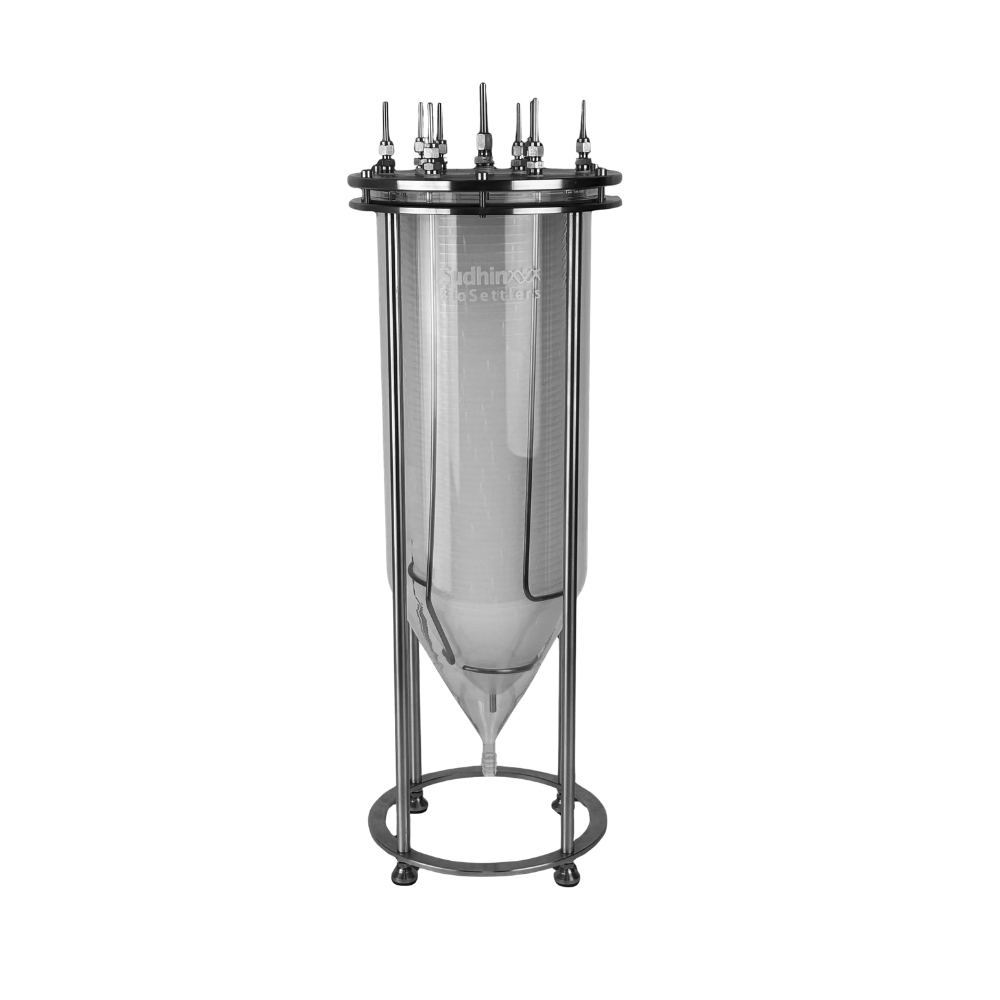 BioSettler Portfolio from Sudhin Biopharma are bioprocessing devices based on a patented technology using inclined/conical settling surfaces. BioSettlers are available in a variety of sizes, with three cylindrical diameter sizes of 75mm, 150mm, or 300mm and different heights resulting in internal liquid volumes ranging from about 250 ml up to 24L. Larger sizes can be designed and manufactured according to customer application and scale.